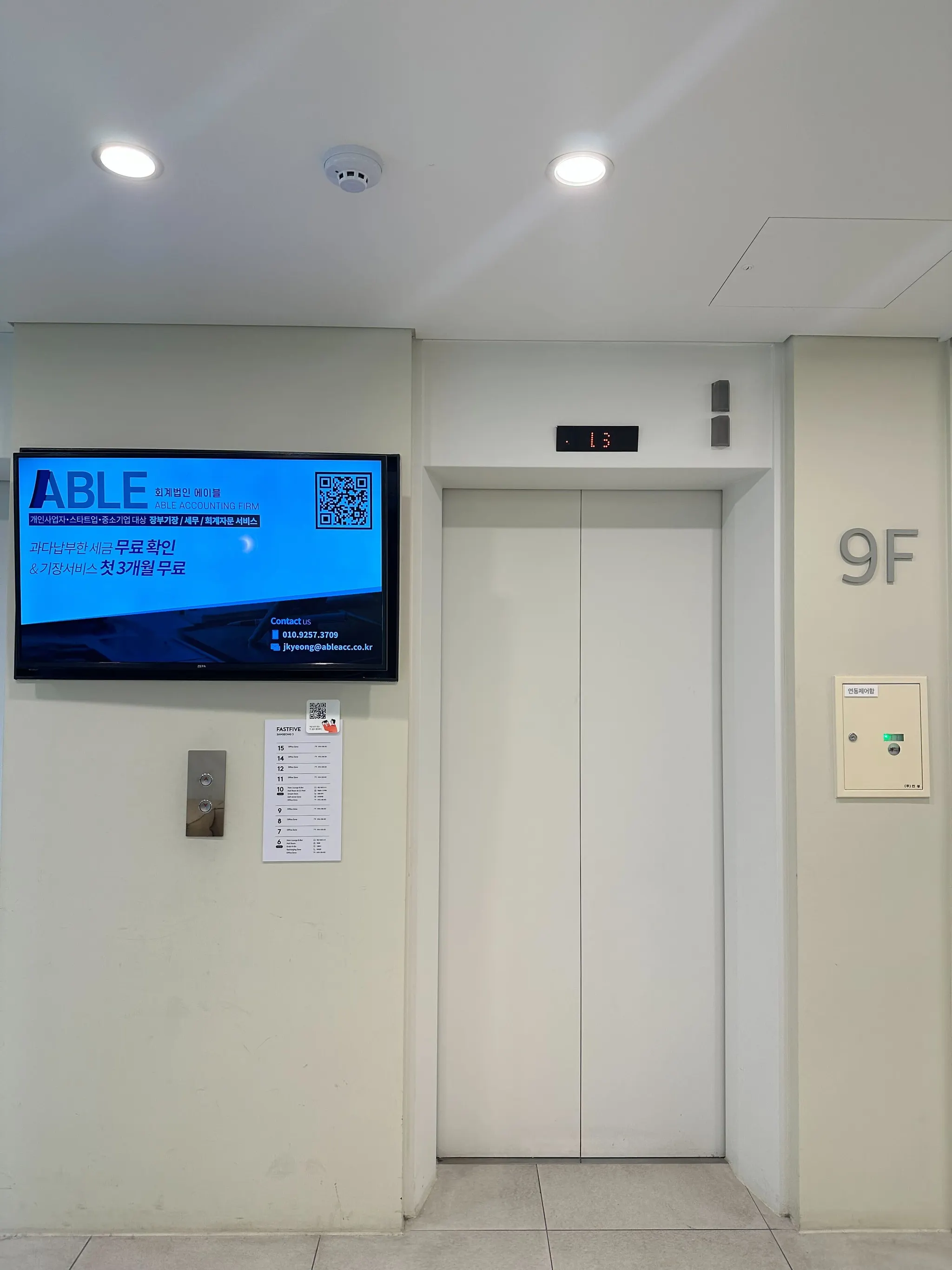 건물로 들어오실 수 있는 출입문은 정문, 후문이 있지만 찾기 쉽도록 정문으로 안내 드릴게요! 국민은행 건물로 들어오셔서 아래 엘리베이터를 타고 9층으로 올라와 주세요.