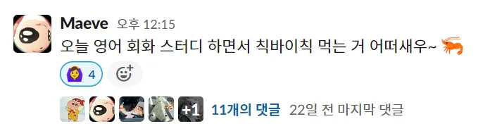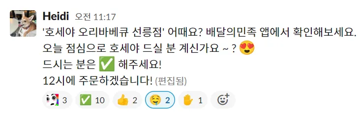 평소에는 #오늘뭐먹지 채널에서 자유롭게 점심 메뉴를 제안하고, 먹고 싶은 메뉴가 같은 동료들끼리 모여 식사를 하고 있답니다.