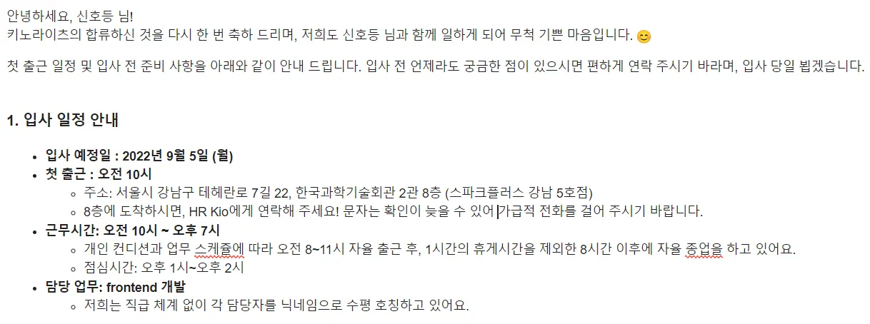 첫 날은 어떤 일정들이 있는지, 사내 분위기는 어떤지 미리 파악해 볼 수 있도록 안내 메일을 통해 읽을 거리를 발송해 드리고 있어요.